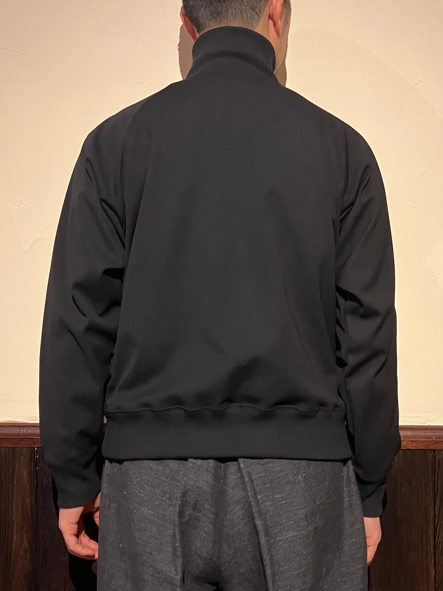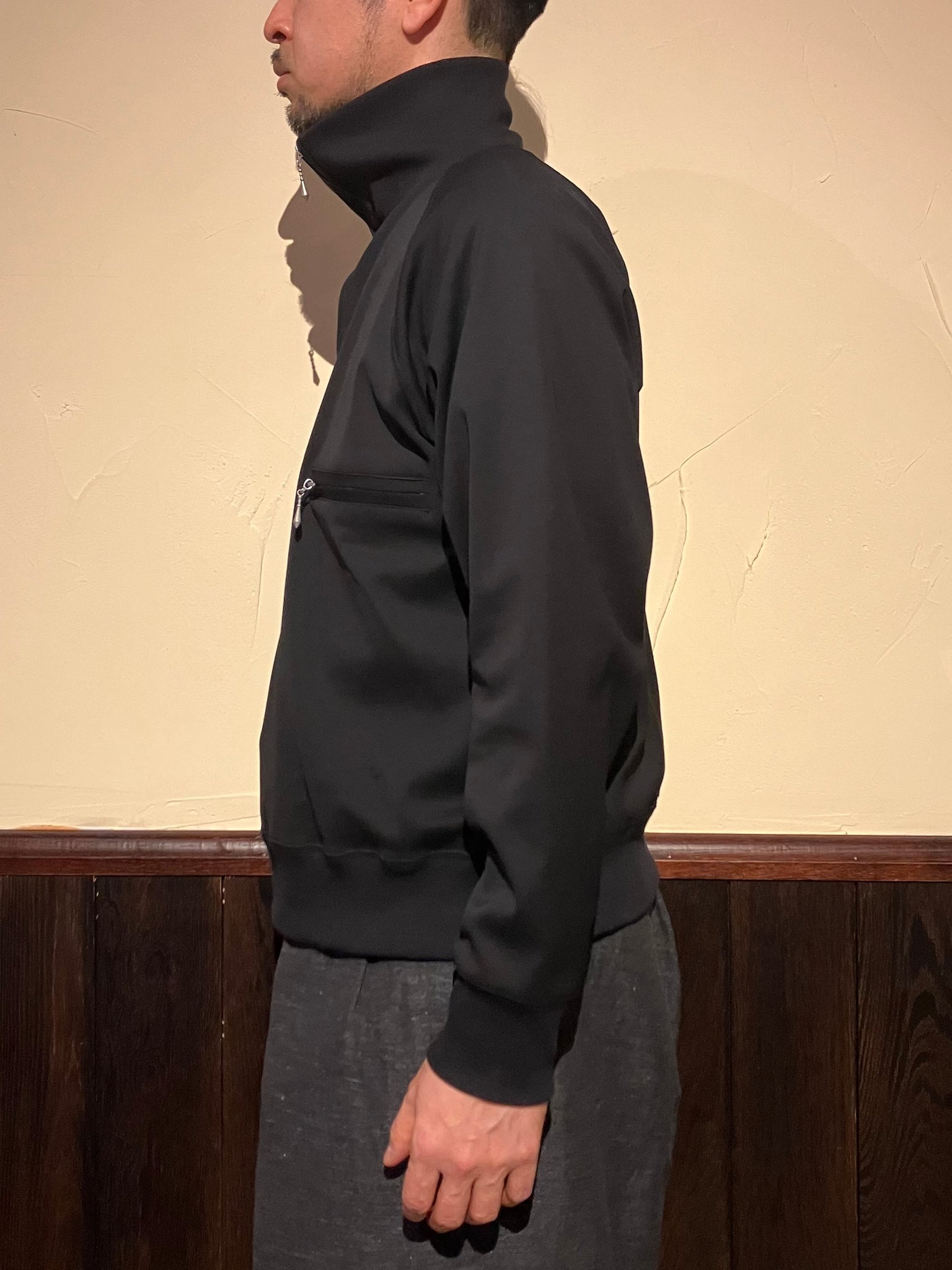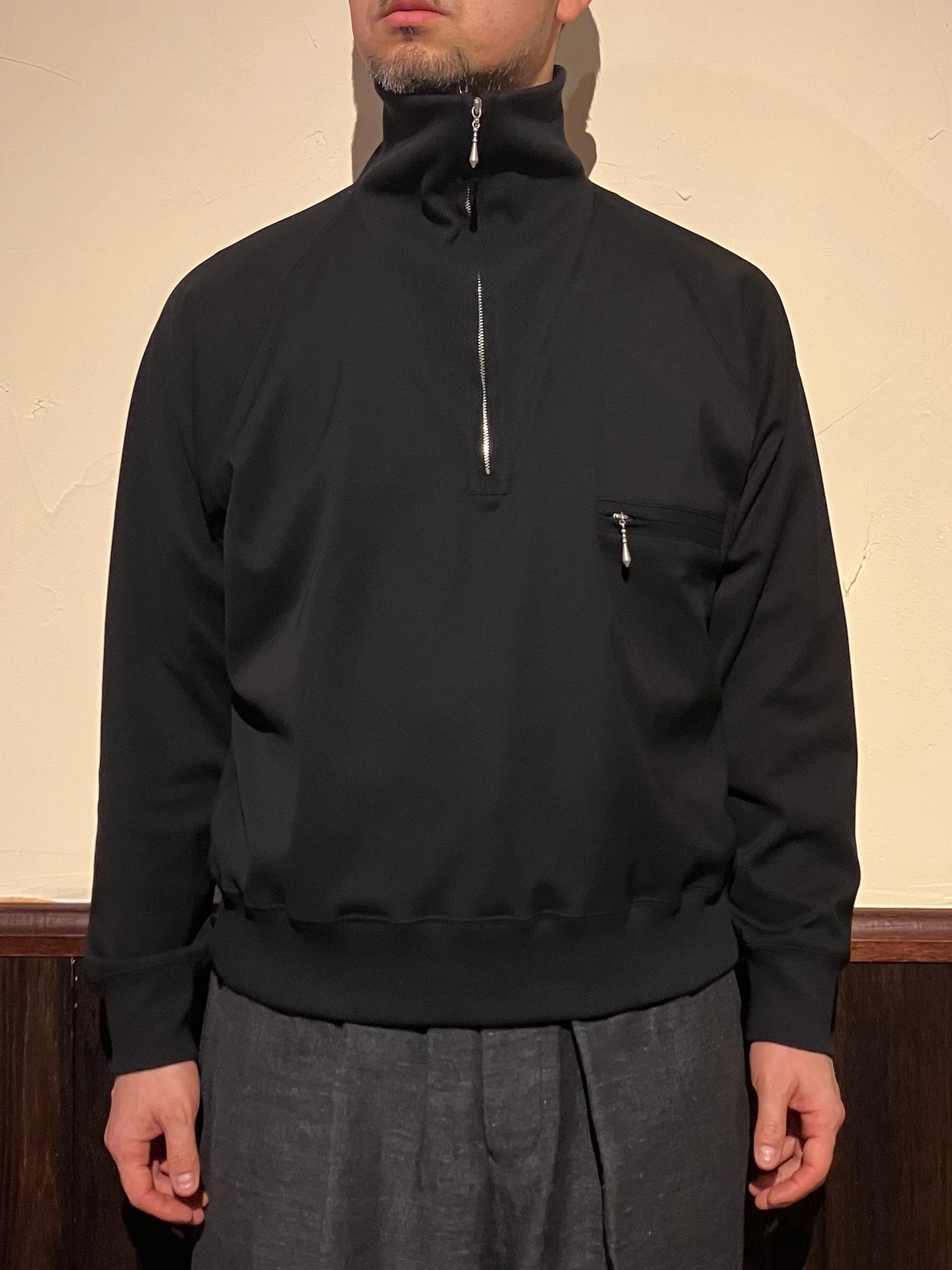 特殊樹脂で反発感を持たせた強撚スムースを使用したハイネックプルオーバージップシャツ。