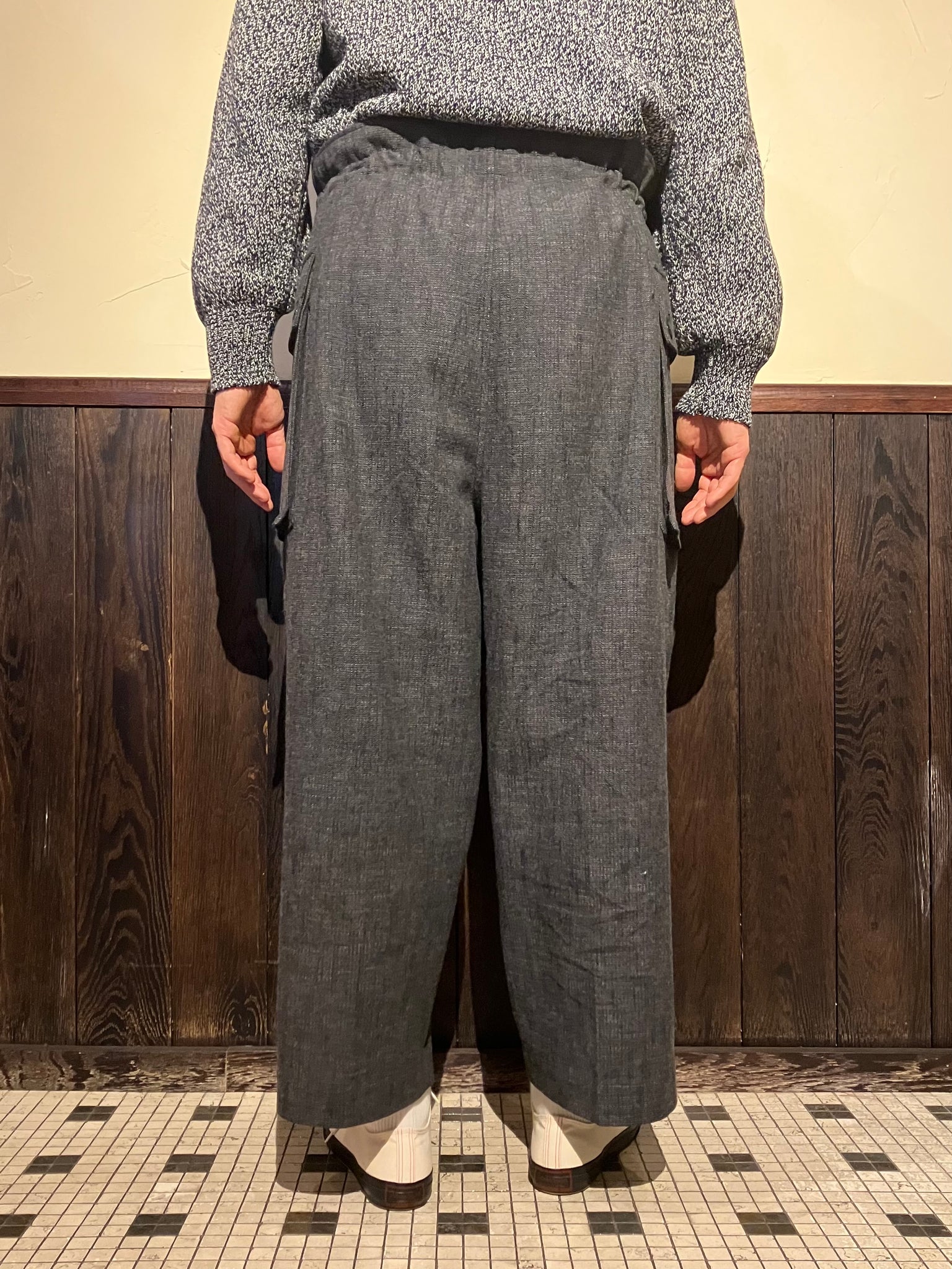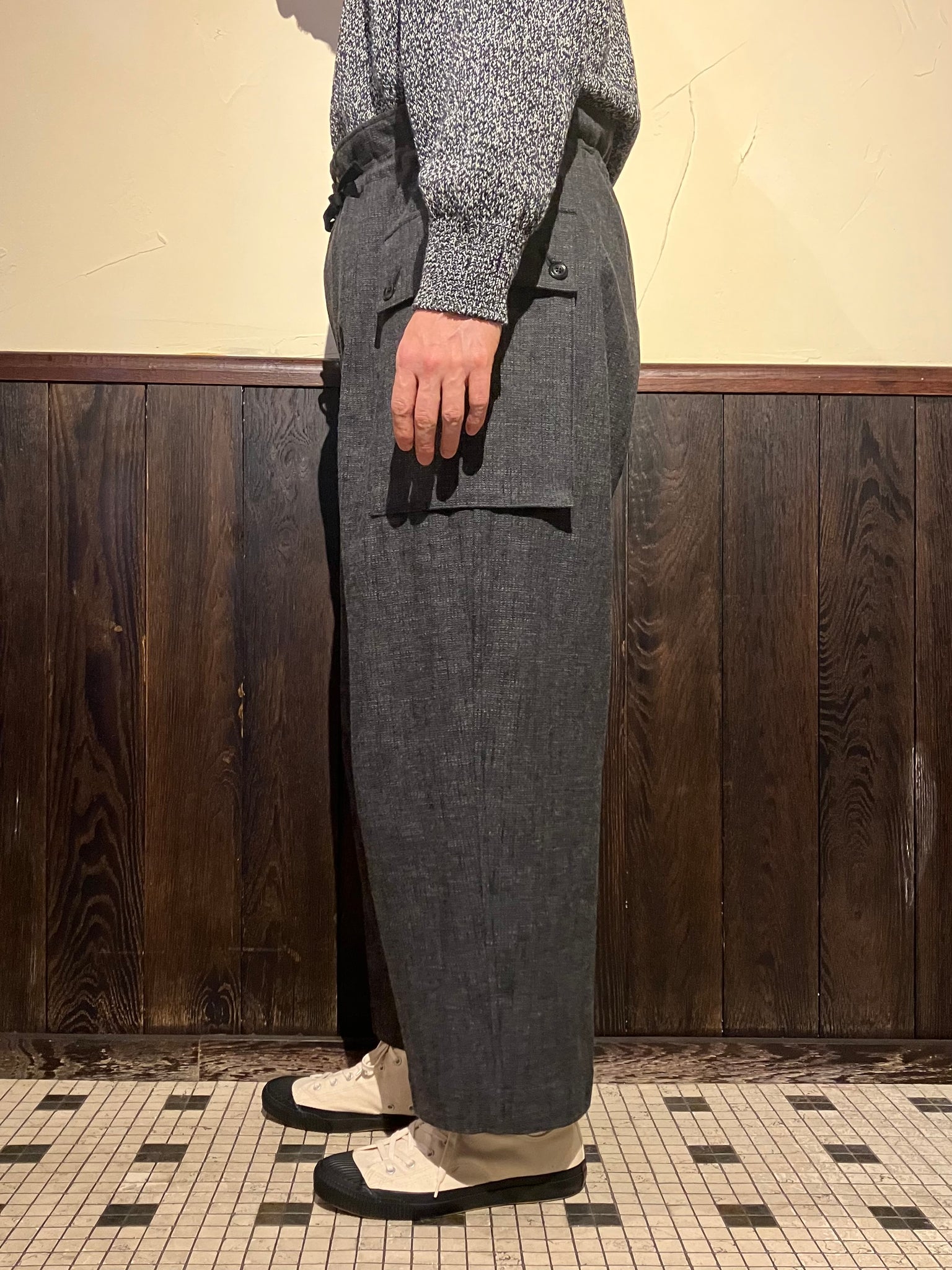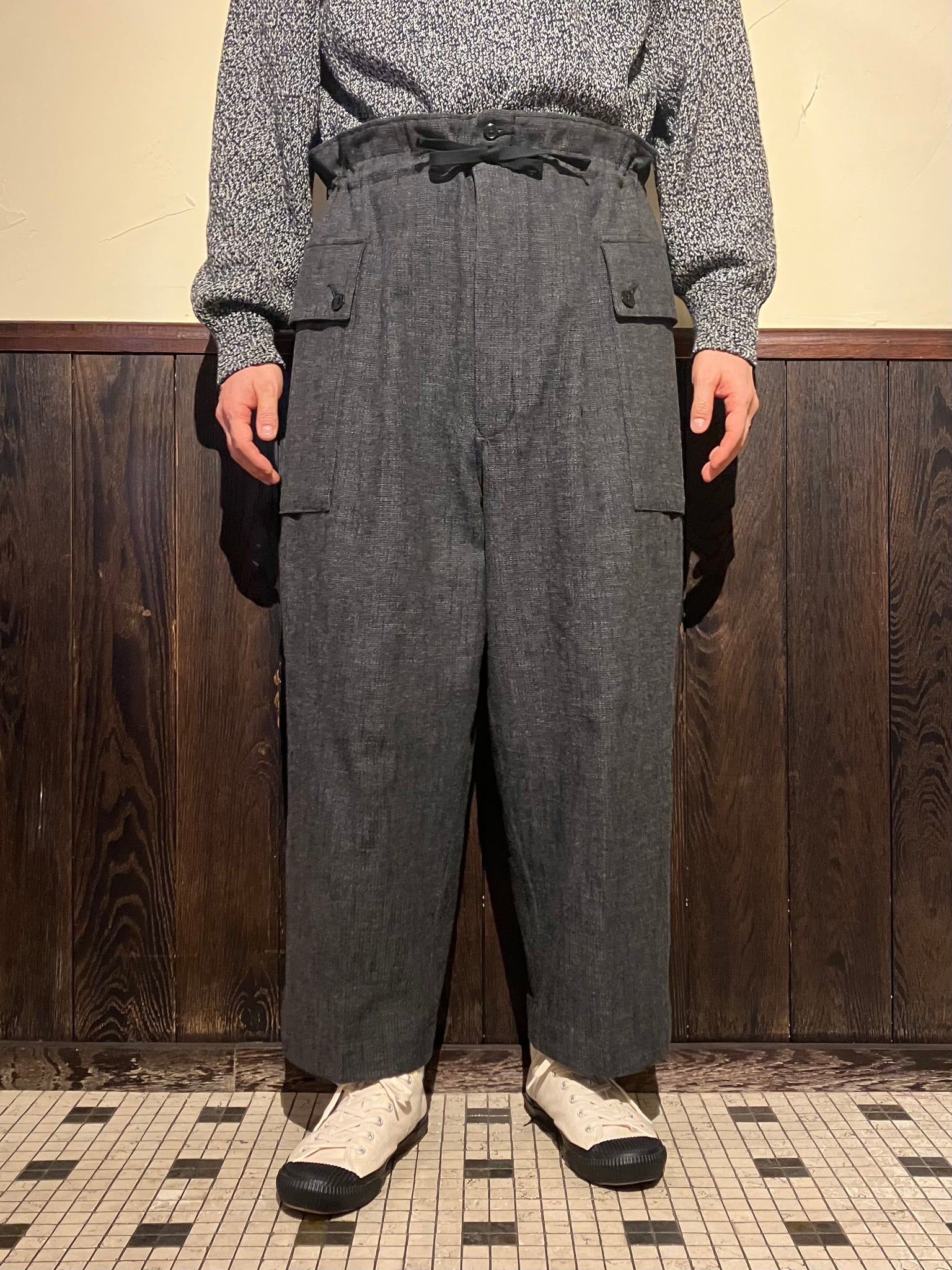 These army wide pants feature large gusseted patch & flap pockets, inspired by M43 HBT pants. The waist is designed to be wider and can be cinched with a herringbone tape for an adjustable fit.
