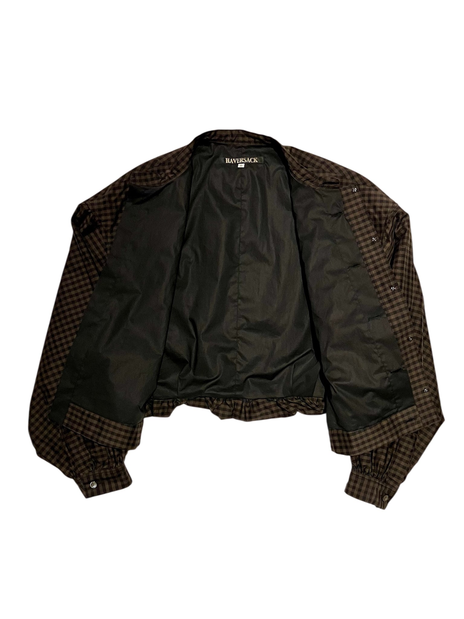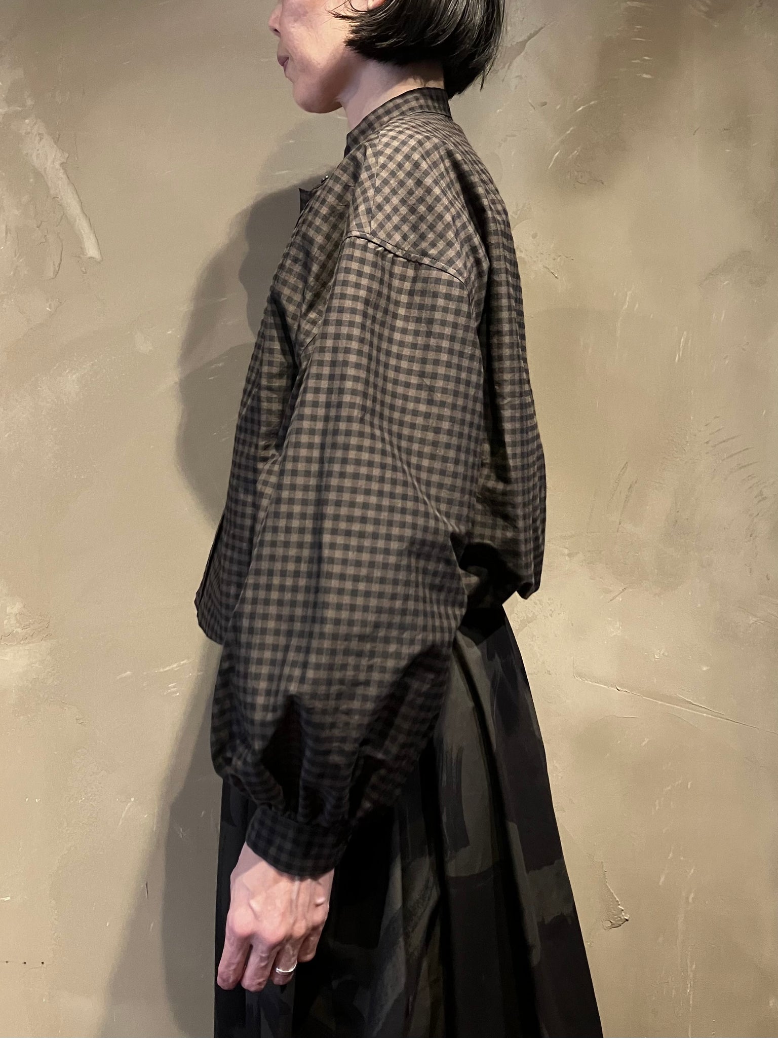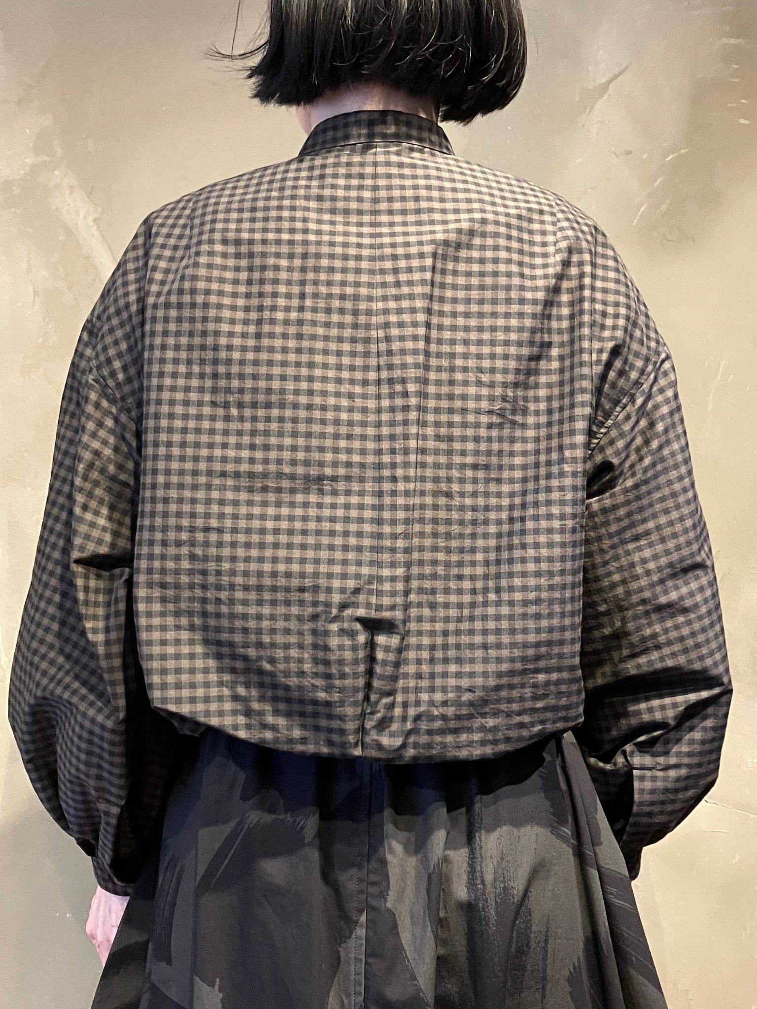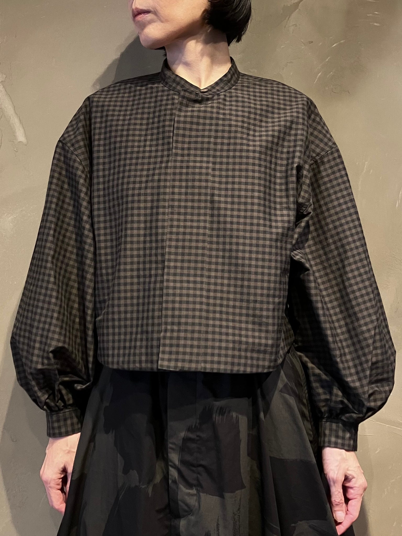 光沢感のあるオリジナルのコットンシルクギンガムチェックを使用したバンドカラーレイヤードクロップドシャツ。
