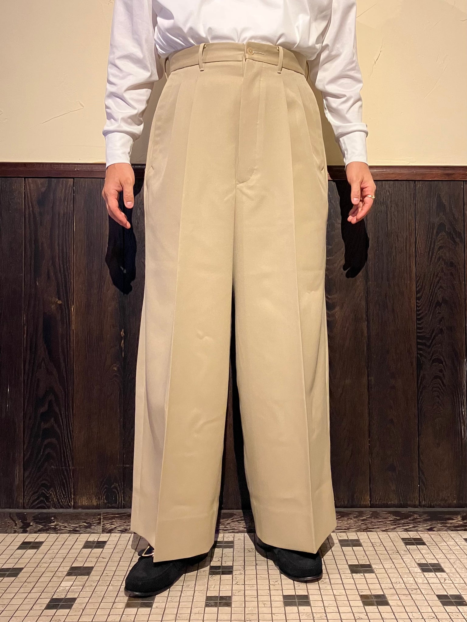 深い股上と、ジャストヒップから真直ぐに綺麗に落ちる、超ワイドシルエットが特徴のハイウエストツープリーツワイドパンツ。