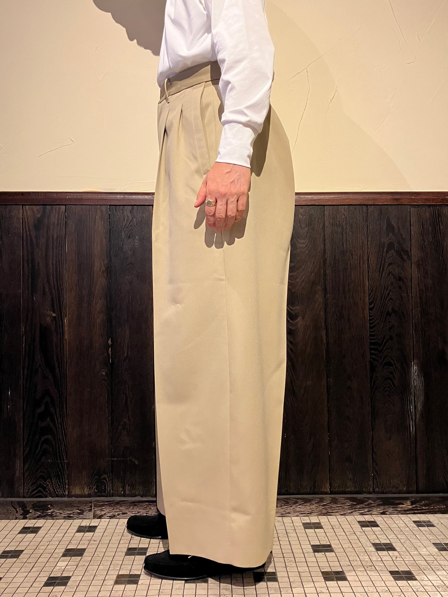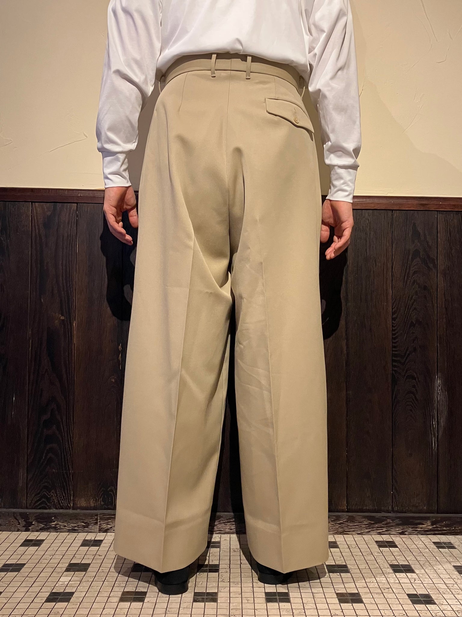 素材には経糸にウール603本撚り糸、緯糸にウール48番双糸を極限まで高密度に織り上げたギャバジンを使用し、綺麗なドレープの入ったドレスパンツに仕上げています。