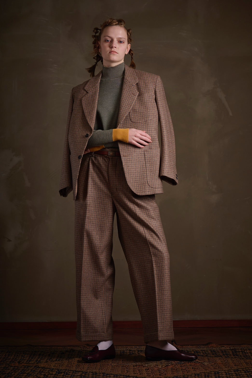 素材はイギリスの老舗サプライヤー、MARLING&EVANSの丁寧に起毛加工を施した、フランネル仕上げのシェパードチェックを使用しています。