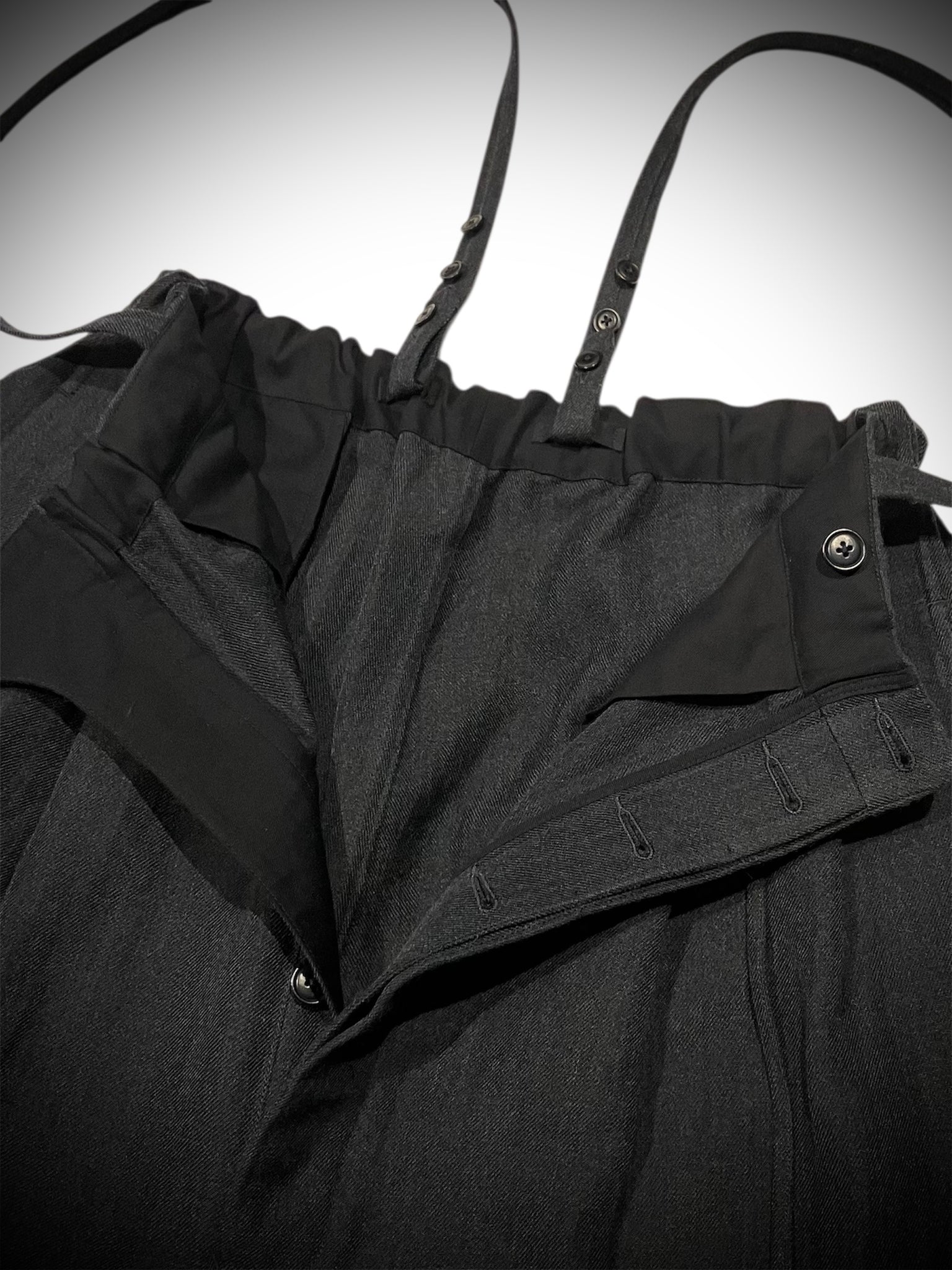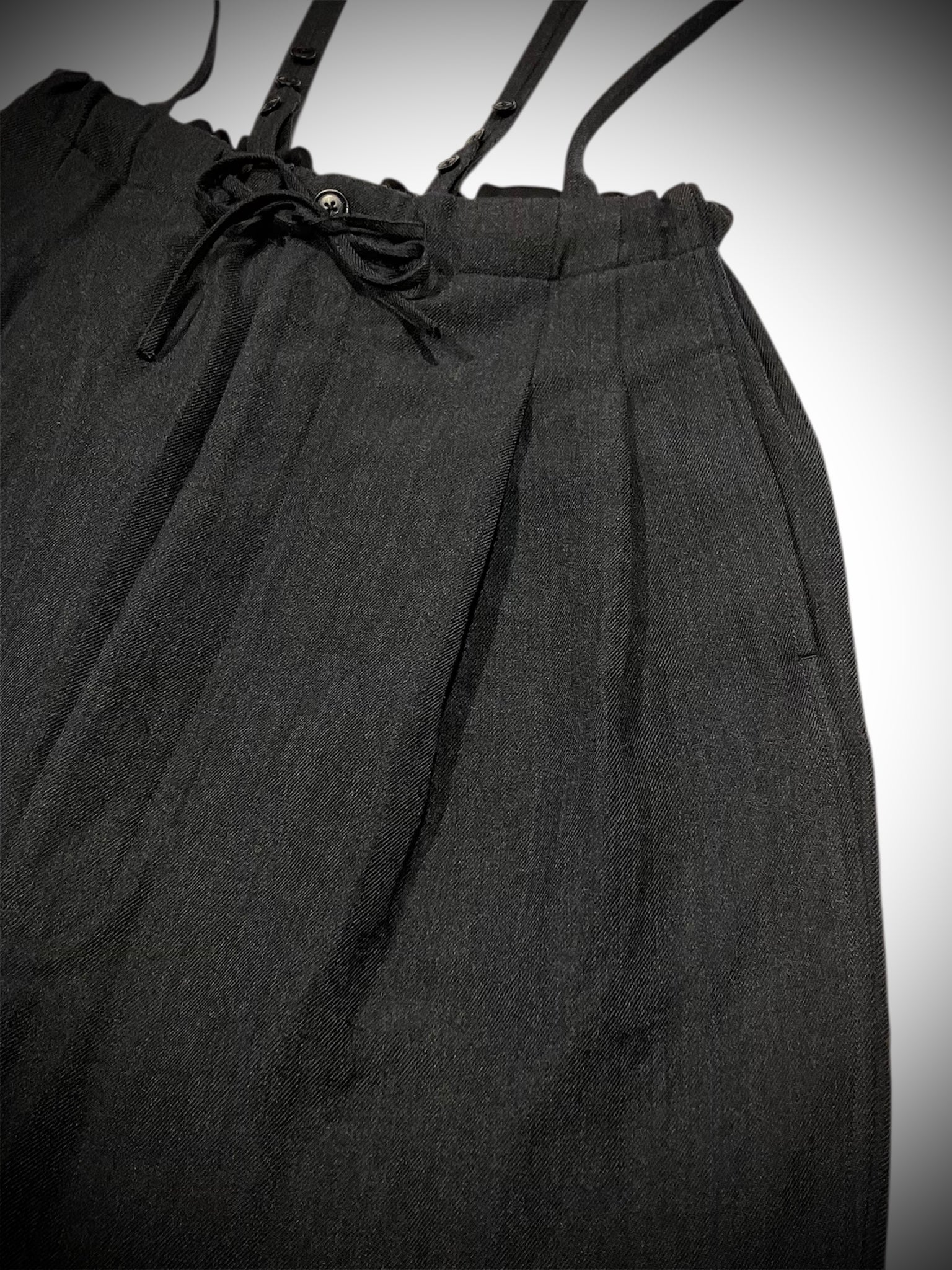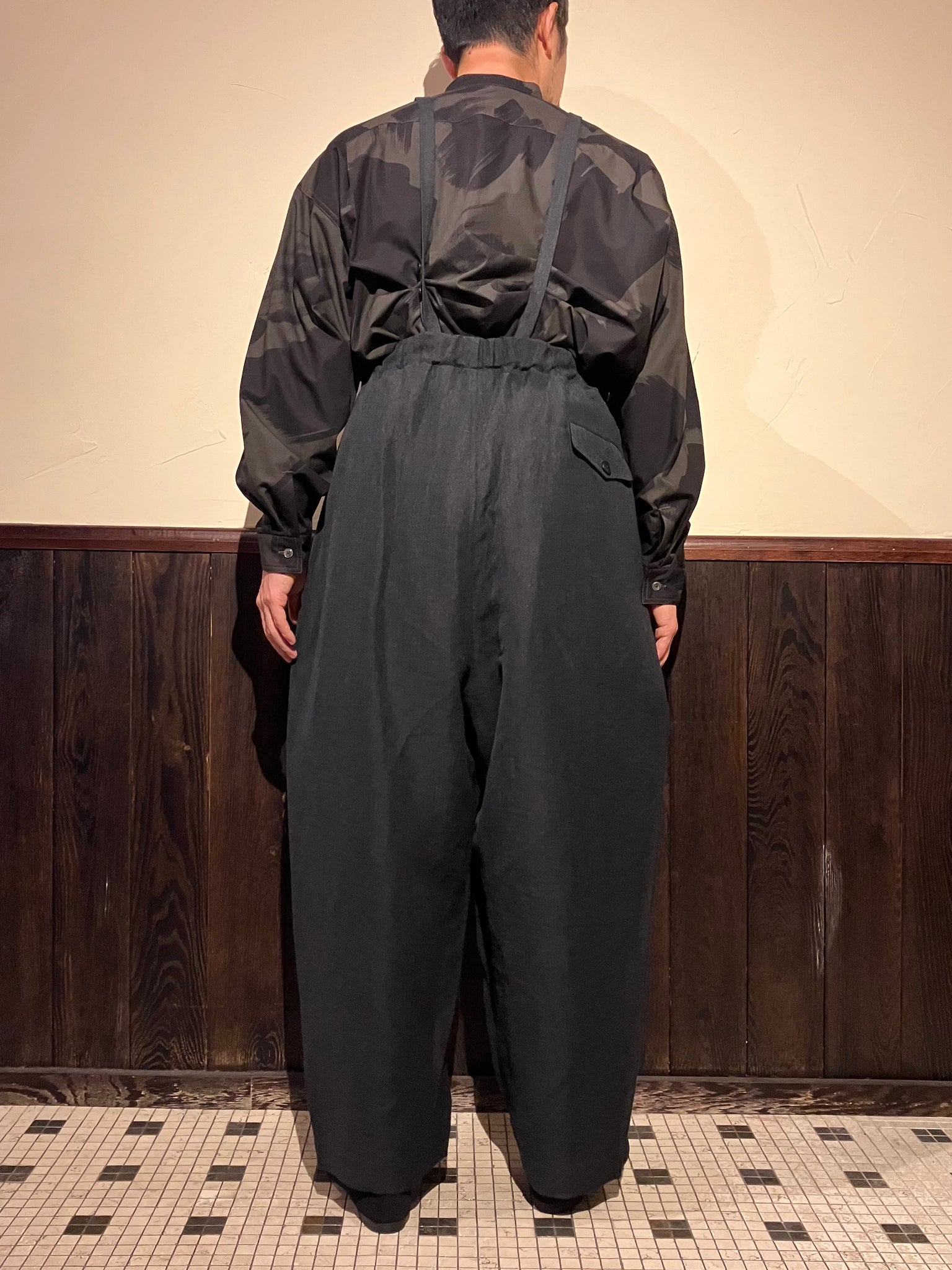 深い股上とウエストにゴムシャーリングを施した、ツープリーツワイドテーパードシルエットに仕上げたサロペットパンツ。肩紐はアジャスト釦で調整できる様デザインしています。