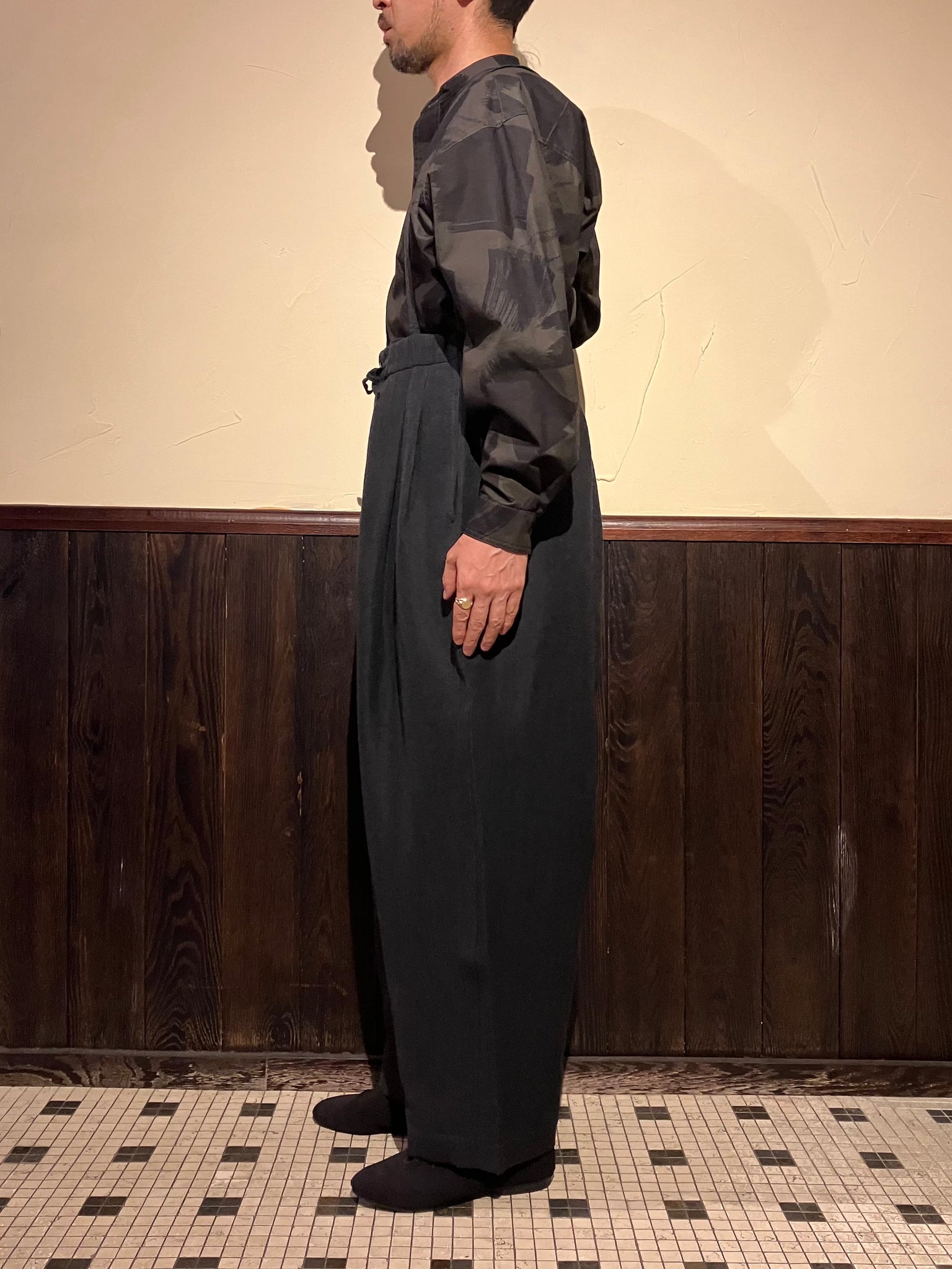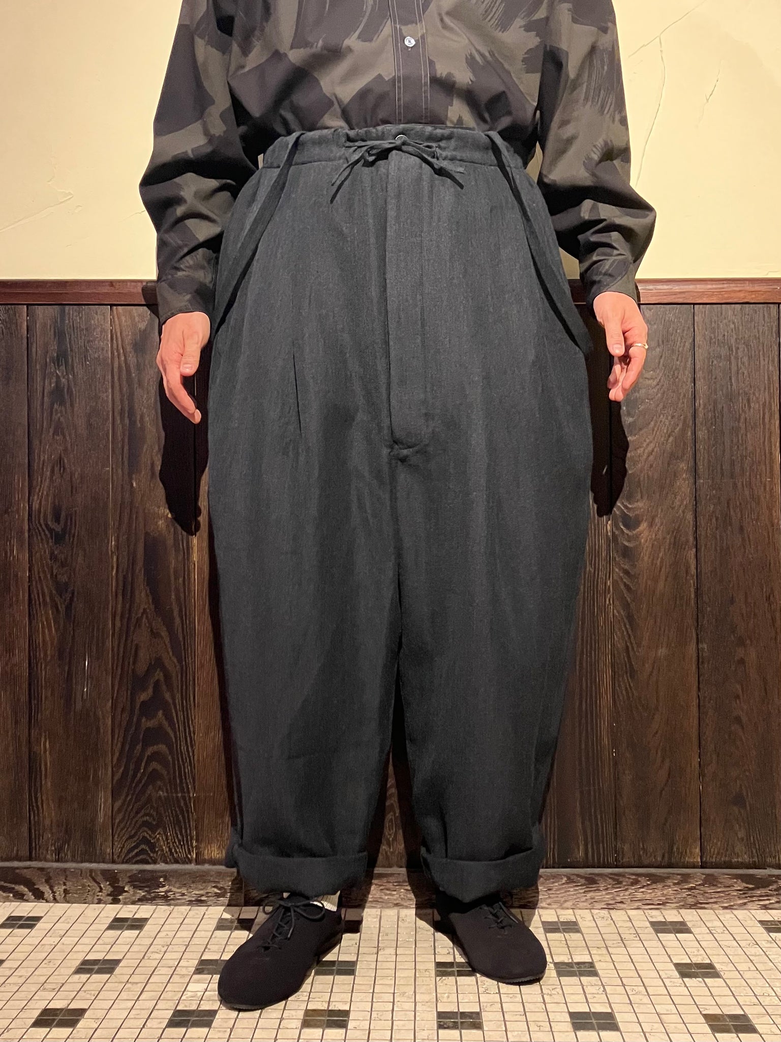 素材は、ウールリネンサージを生地でタンブラーワッシャーを施し、シワ感と柔らかな風合いに仕上げています。