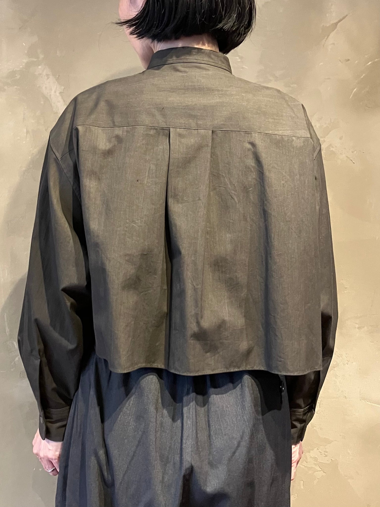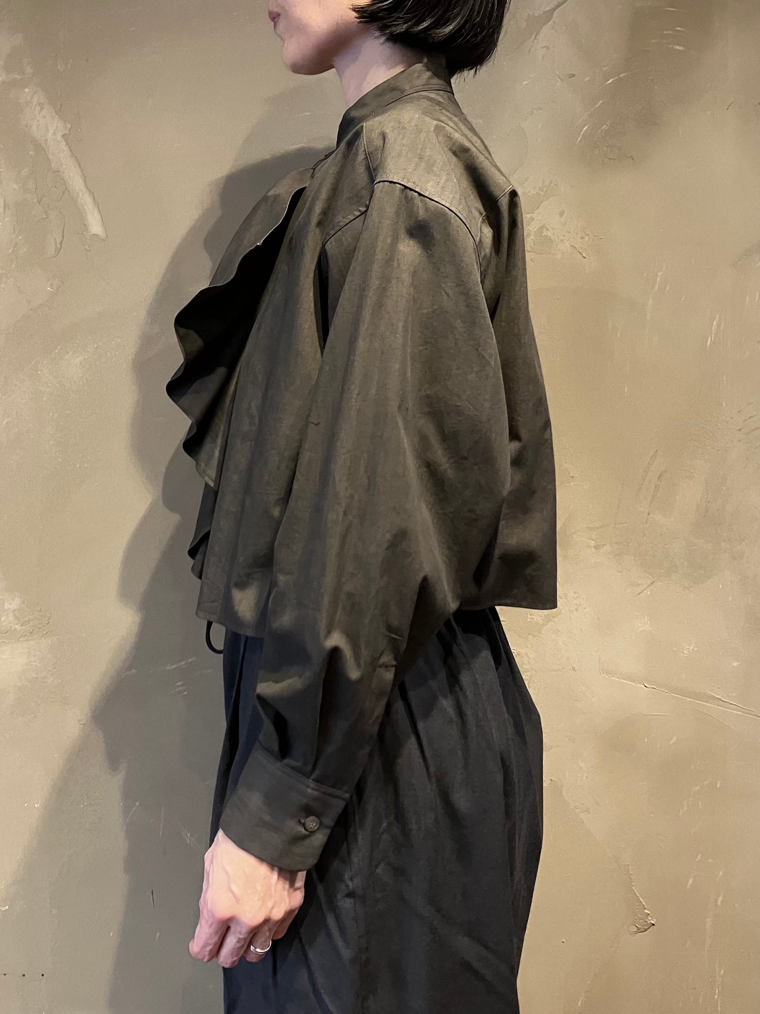 オーバーサイズシルエットに仕上げた、クロップ丈のフリルシャツ。