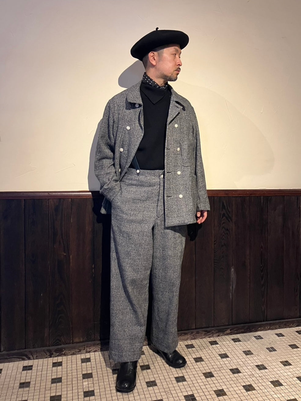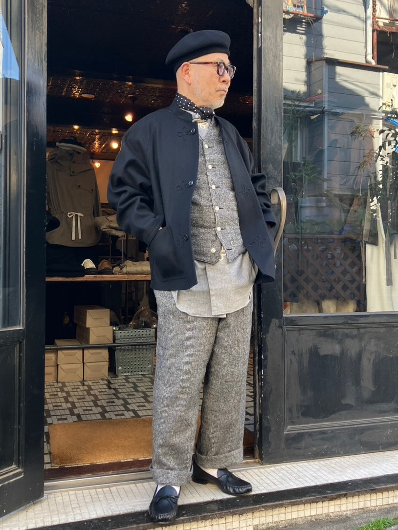 素材はコットンウールに縮絨を施し、シボ感のある柔らかな風合いに仕上げたグレンチェックを使用し、ボタンには刻印を施したボーンボタンを使用しています。