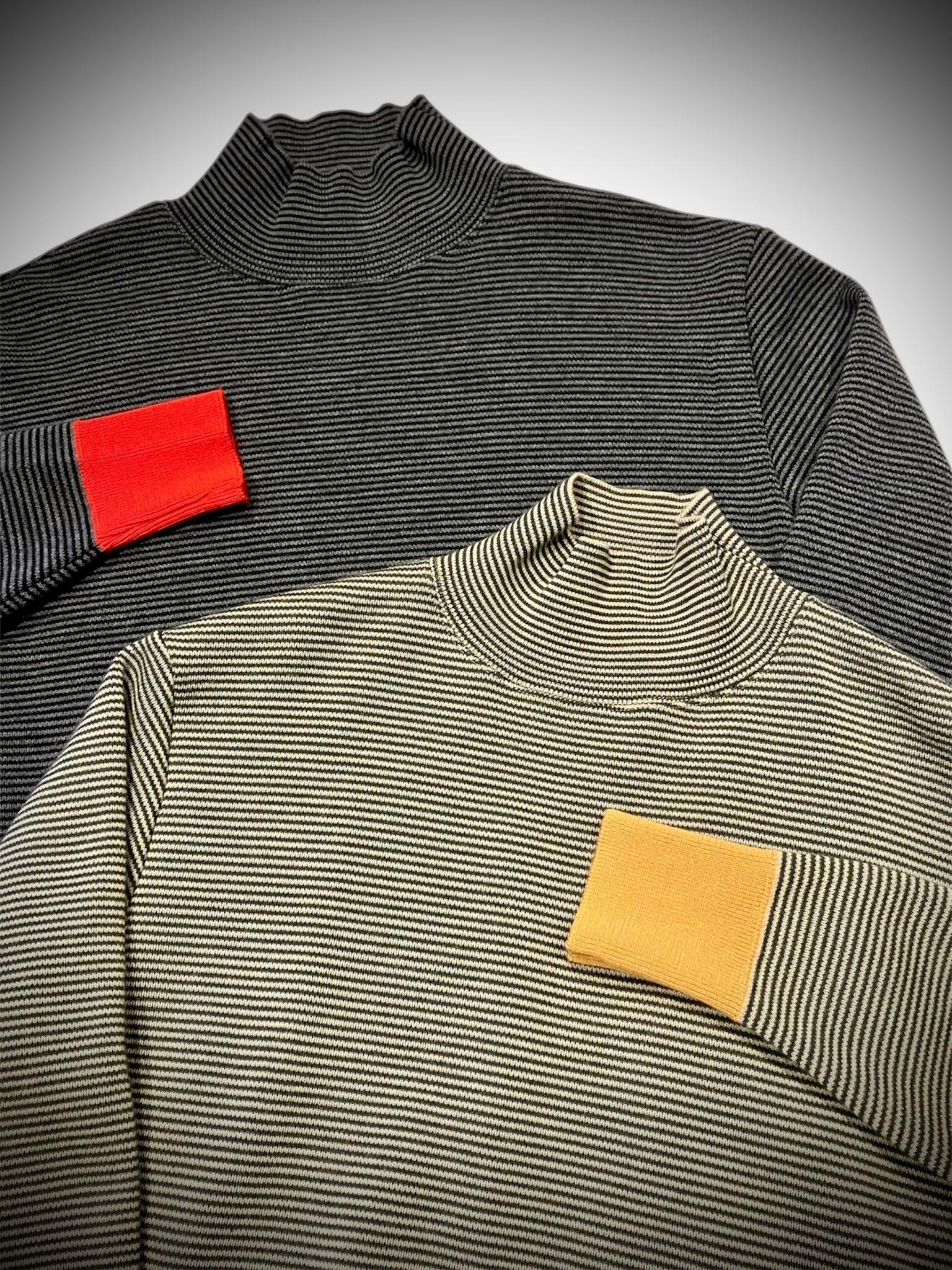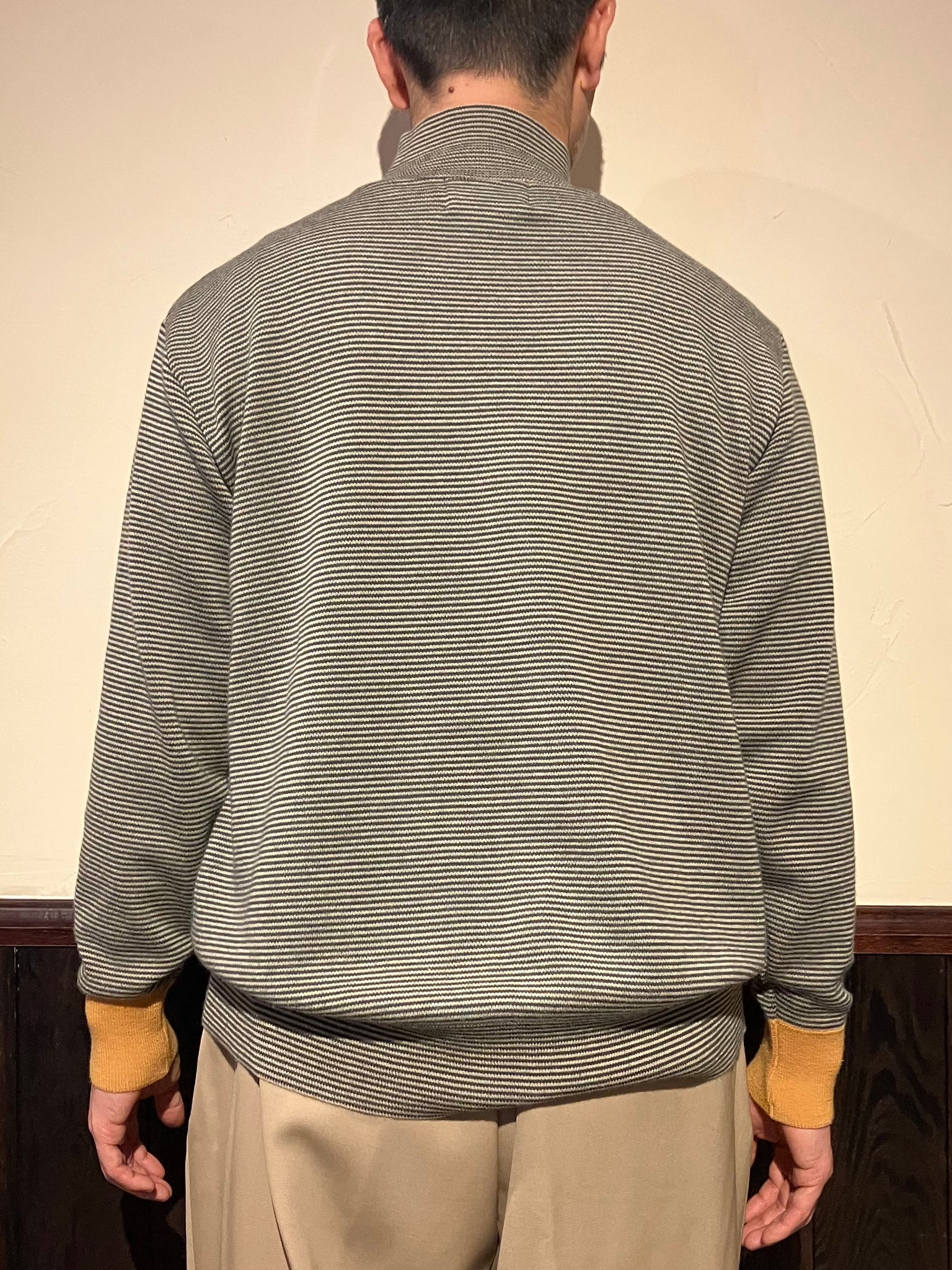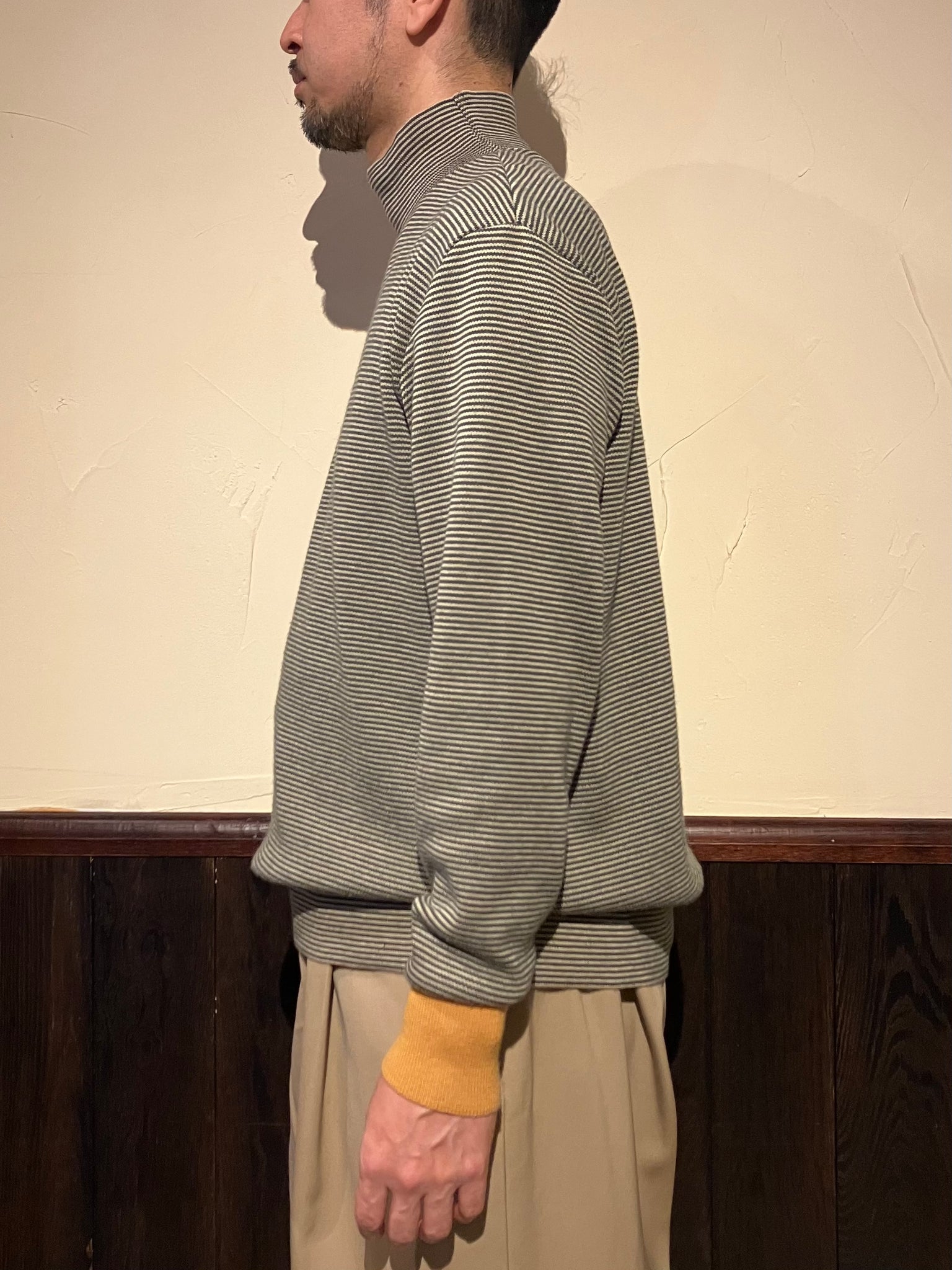 国内では希少な丸編み成形機で製作したハイネックスムースボーダーニット。